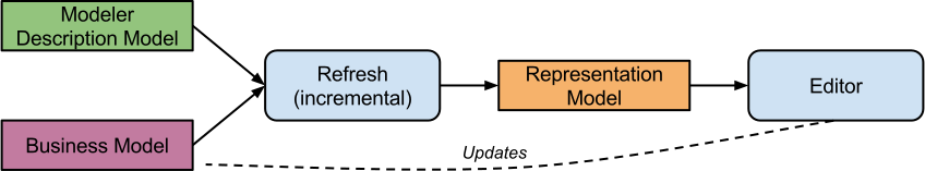 representation model (and the corresponding meta-model), which describes the concrete representation(s) of end-users business models according to what is configured in the modelers’ specifications (i.e. which concrete business elements are represented, and how they look). These representation models are produced by the Sirius runtime using a refresh algorithm which produces a “projection” of the business data onto the representation domain using the rules defined in the modeler’s definitions.