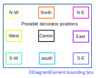 Diagrams support several kinds of graphical constructs: simple nodes, containers (which can contain other nodes or containers), lists, bordered nodes (nodes which appear on the side of other elements, typically to represent ports), and edges between all of these. Each kind of element supports a rich set of possible styles (shape and color).