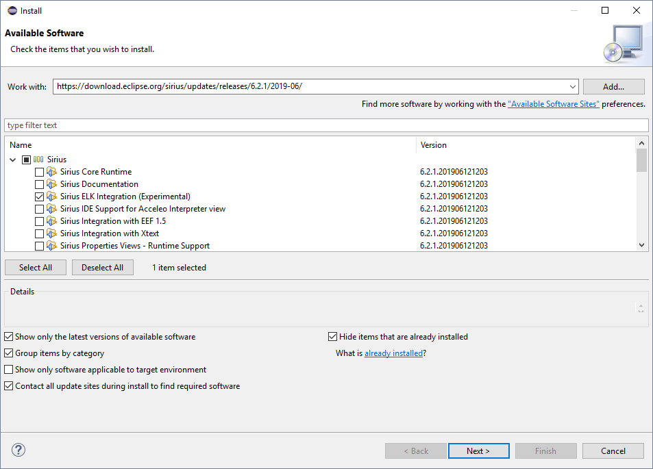 Additional layout algorithms can be available if you have installed the ELK integration feature with Sirius. Please refers to the ELK documentation if you want details about these algorithms. This feature is considered as experimental because of remaining bugs concerning the ELK integration.