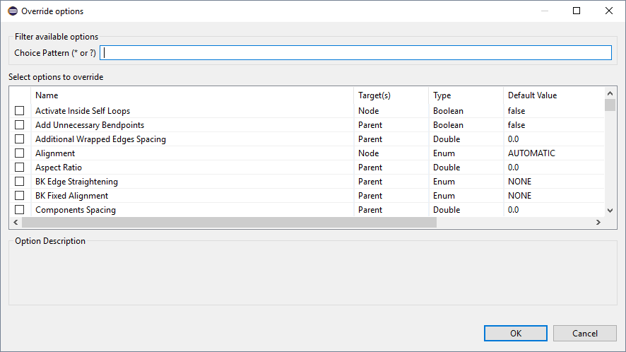 Add option override will open a dialog allowing you to override supported options of the layout algorithm: