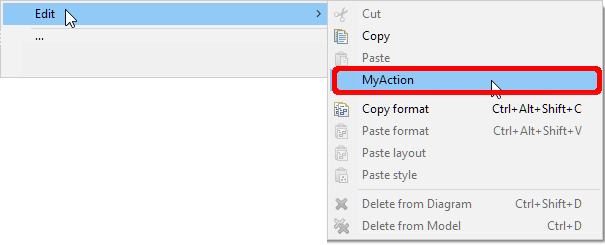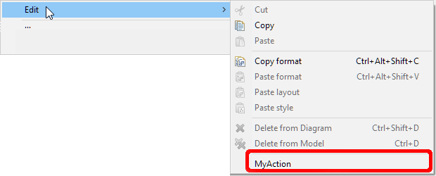 This tool can be used to define an operation which will appear as an entry in the context menu (or in a sub-menu if defined inside a Popup Menu element). When invoked, the body of the action is executed with the views variable referencing all the representation elements which were selected on the diagram.