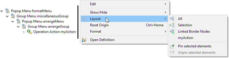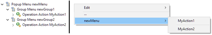 This tool can be used to define an entry in the context menu which can contain Operation Actions and External Java Action tools. Which ones are visible when the menu is opened depend on the preconditions of these actions, which can thus be activated or not depending on the currently selected element. Actions can be grouped using the Group Menu .