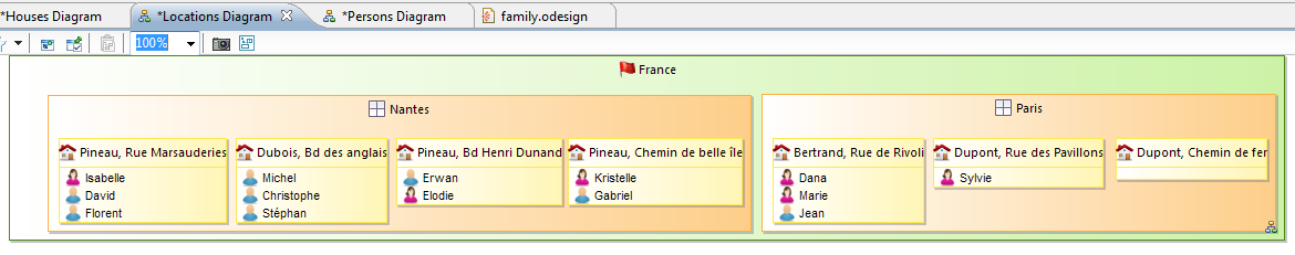 As the specifier of Sirius diagrams, you have total control on how the elements in your semantic models are represented using the constructs provided by Sirius, and how they behave. In particular, this means the structure of the graphical elements shown on a diagram (which element contains which, how they are connected) does not have to match the “physical” structure of the semantic model being represented. The two are completely de-correlated, and you can choose to represent your semantic models in ways which make sense from various point of views.