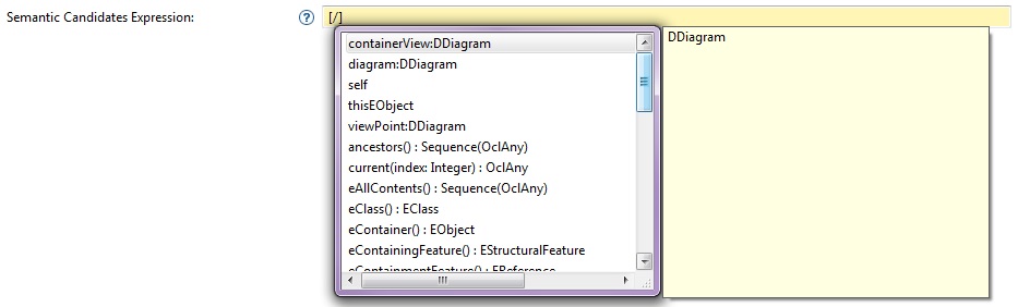 Auto-completion. First, in the VSM editor, any field in the property view which has a yellow background is an interpreted expression. In these fields, auto-completion can be triggered by hitting Ctrl+Space.