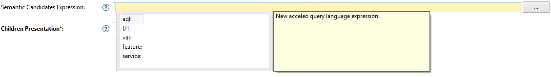 "prefix[someExpression/]suffix"). Instead, you can use Acceleo’s string manipulation operations to obtain the same result: ['prefix' + someExpression + 'suffix'/]). Related to this, auto-completion only works if you are inside a well-formed bracket (i.e. [<cursor>/]); if you have simply opened the bracket but not closed it (i.e. [<cursor>), completion will not be available.