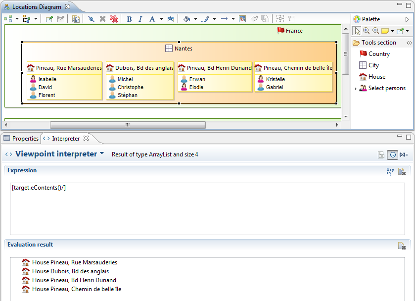 Interpreter view from an element selected in a Sirius representation, the context of the expression is
